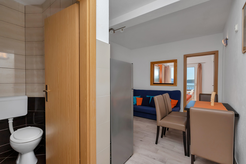 Apartment A6 (2+2) is on the second floor. Maximum occupancy is four people. The apartment has a bathroom, a kitchen with a pull out sofa, separated bedroom with double bed and a sea-view balcony. The apartment has a brand new kitchen and new tiles. The apartment is suitable for couples, three adults or two adults and two children.